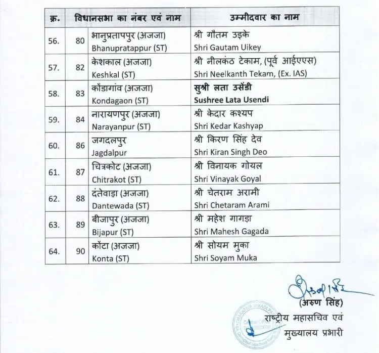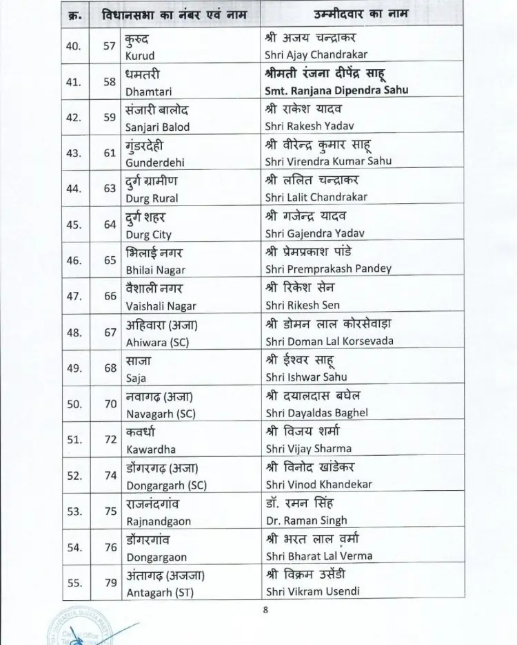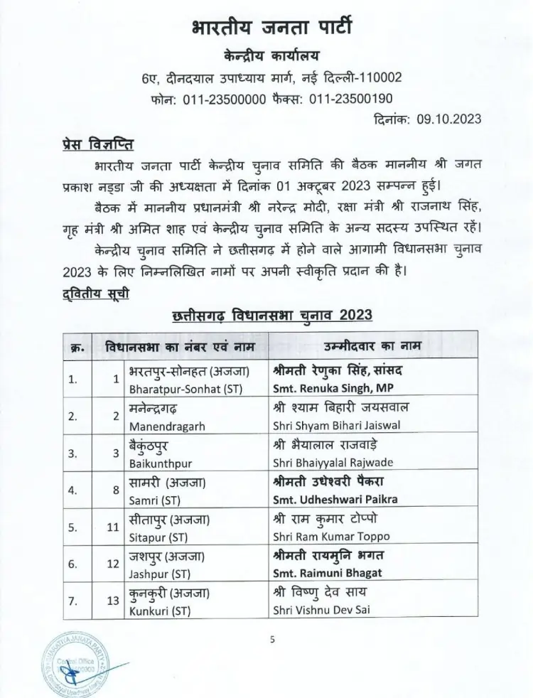भारतीय जनता पार्टी ने छत्तीसगढ़ में प्रत्याशियों की दूसरी लिस्ट जारी की है। इससे पहले पार्टी 21 उम्मीदवारों के नामों का ऐलान कर चुकी है।