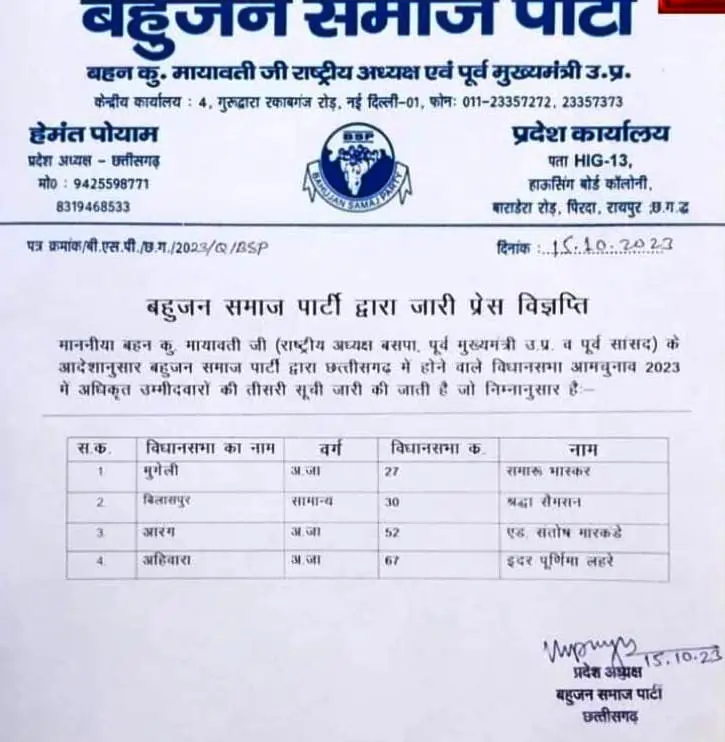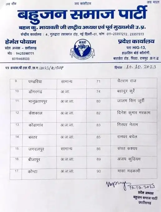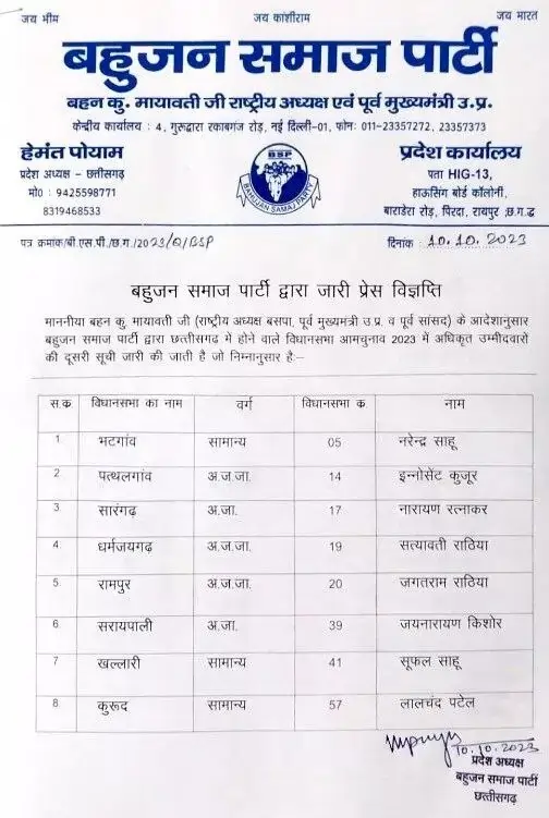 आपको बता दें कि इससे पहले बहुजन समाज पार्टी (बसपा) ने छत्तीसगढ़ विधानसभा चुनाव 2023 के लिए अपने प्रत्याशियों की लिस्ट जारी की थी, जिसमें कुल 17 उम्मीदवारों के नाम शामिल थे।