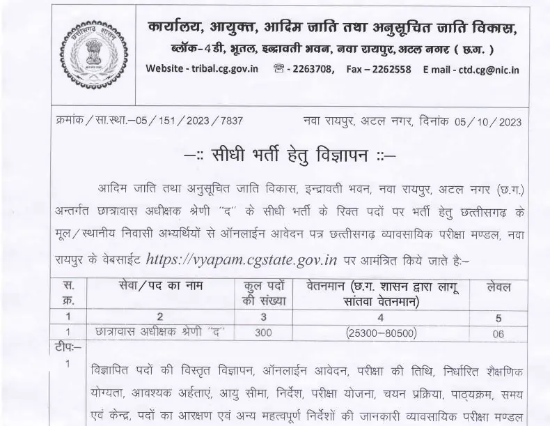 छत्तीसगढ़ आदिवासी विभाग भर्ती: छात्रावास अधीक्षक के 300 पदों पर निकली वैकेंसी, जल्द करें आवेदन