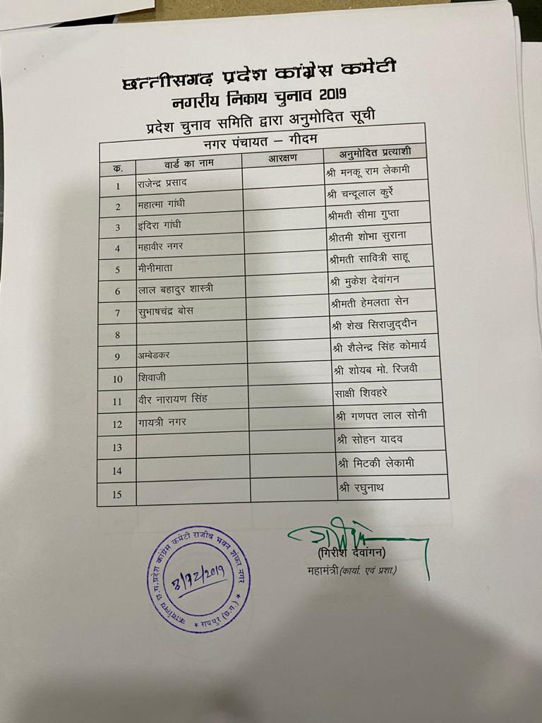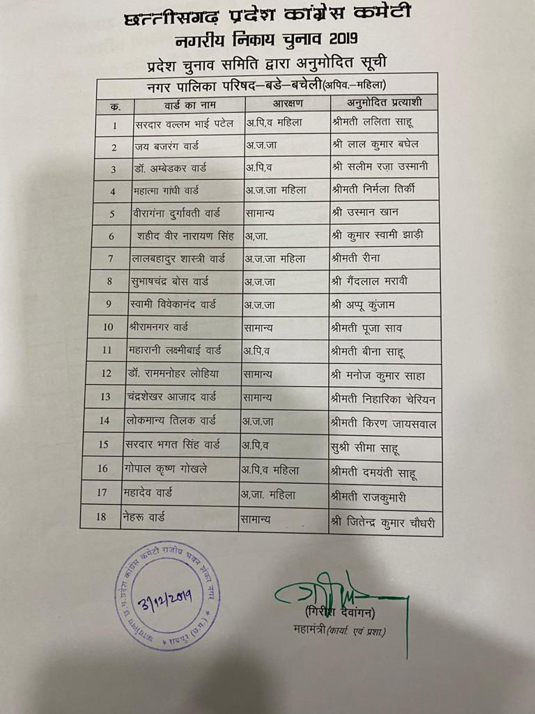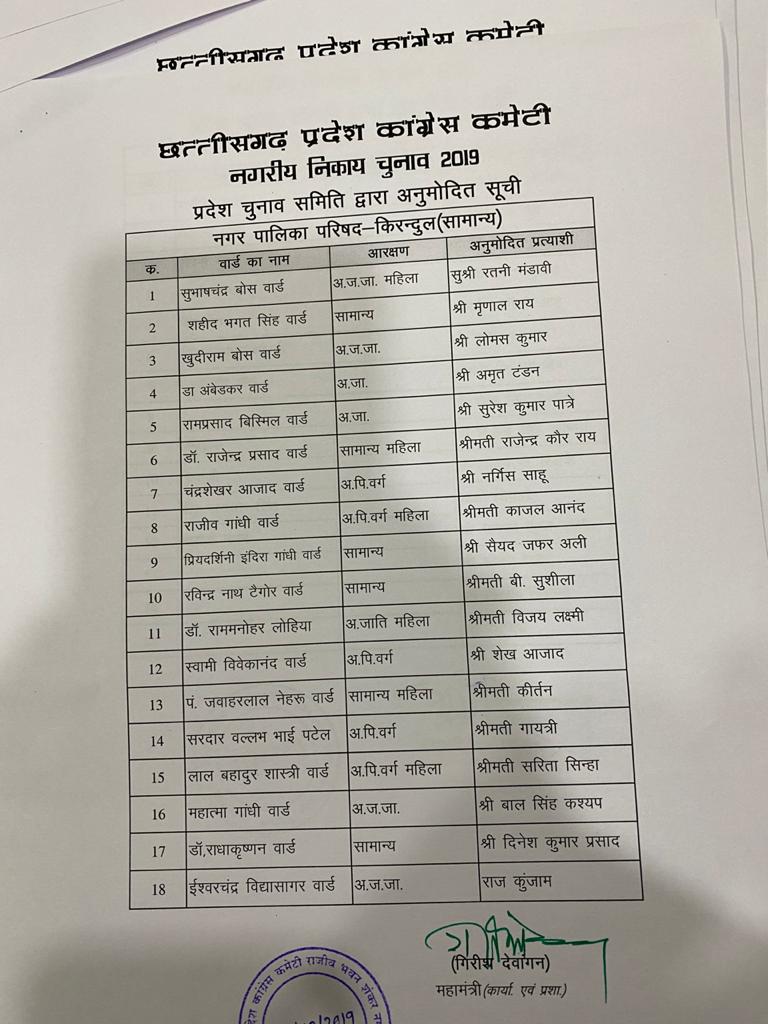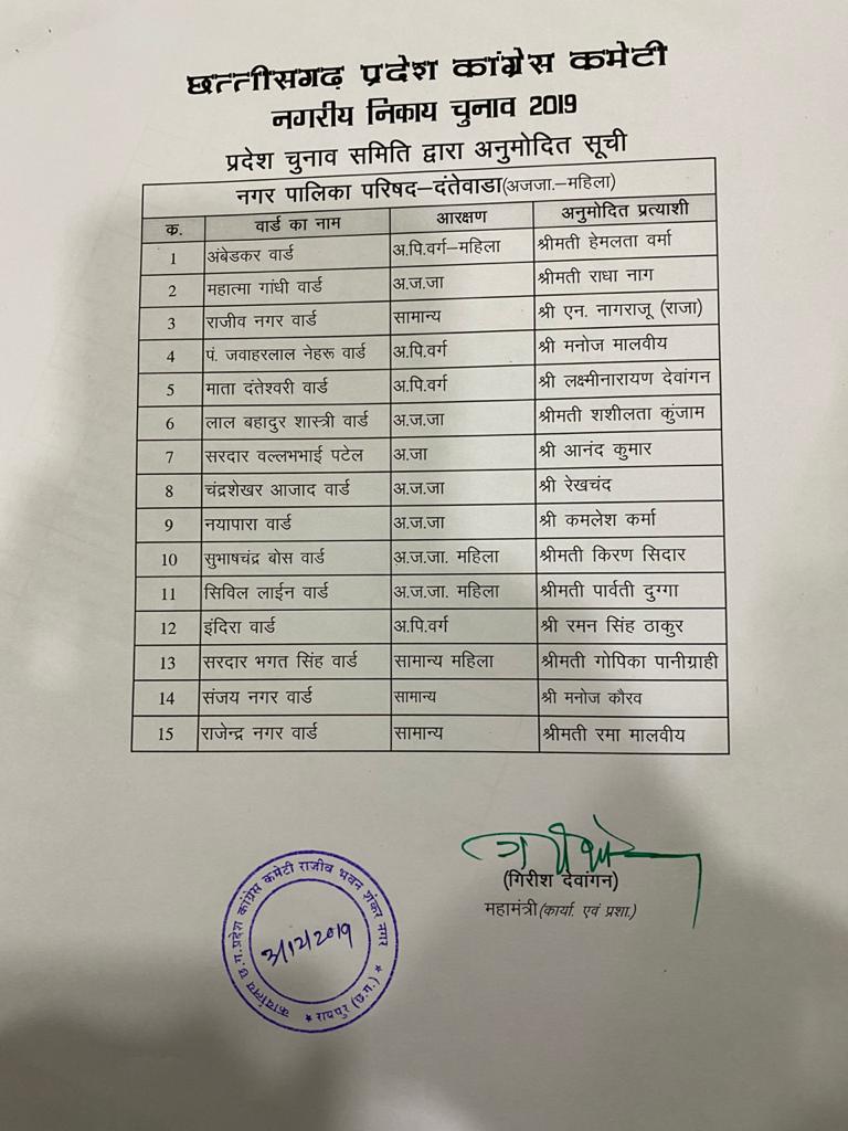 कांग्रेस ने दंतेवाड़ा, बचेली व किरन्दुल नगरपालिका समेत गीदम व बारसूर नगर पंचायत के सभी वार्डों के लिए उम्मीदवार घोषित कर दिए हैं। इस सूची में कई मौजूदा पार्षदों के नाम भी शामिल हैं। वहीं कुछेक का टिकट काटा भी गया है।