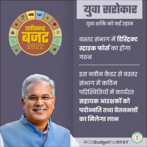 बजट में सीएम ने बस्तर में तैनात सहायक आरक्षकों को प्रमोशन देने की भी घोषणा की है। सीएम बघेल ने कहा है कि पिछले कई सालों से जिन आरक्षकों का प्रमोशन और वेतन वृद्धि नहीं हो पाई है, इस घोषणा से उनकी वेतन वृद्धि और प्रमोशन हो सकेगा।