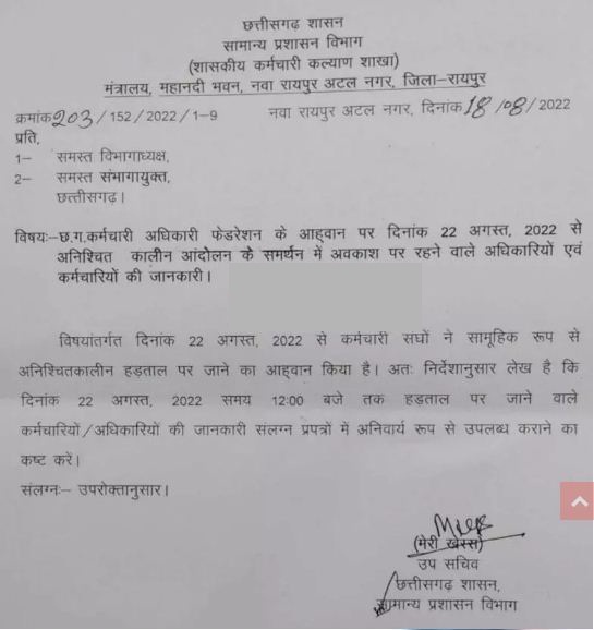 इधर, कर्मचारी-अधिकारी फेडरेशन द्वारा बेमियादी हड़ताल की घोषणा ने सरकार की चिंता बढ़ा दी है। छत्तीसगढ शासन के सामान्य प्रशासन विभाग ने सभी विभाग प्रमुखों को पत्र भेजकर 22 अगस्त को दोपहर 12 बजे तक दफ्तरों में नहीं पहुंचने वाले कर्मचारी-अधिकारियों की सूची मंगाई है।