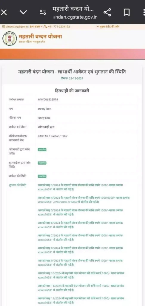 इस योजना के तहत एक पंजीकरण सामने आया है, जिसमें लाभार्थी का नाम “सनी लियोन” दर्ज है। चौंकाने वाली बात यह है कि आवेदन में पता बस्तर जिले का दिया गया है। यह खाता न केवल सत्यापित है, बल्कि इसमें नियमित रूप से एक हजार रुपये ट्रांसफर भी किए जा रहे हैं।