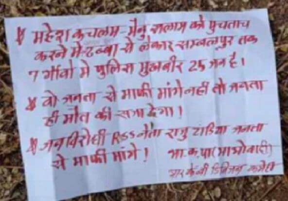 नक्सलियों ने पर्चा फेंककर स्थानीय भाजपा नेता को माफी मांगने का फरमान जारी किया है। वहीं 25 अन्य लोगों को भी कथित तौर पर पुलिस का मुखबिर बताते हुए चेतावनी जारी की गई है।आरकेबी डिवीजन द्वारा फेंके गए पर्चे में राजू टांडिया को RSS का नेता बताते हुए जनता से माफी मांगने का फरमान जारी किया है।