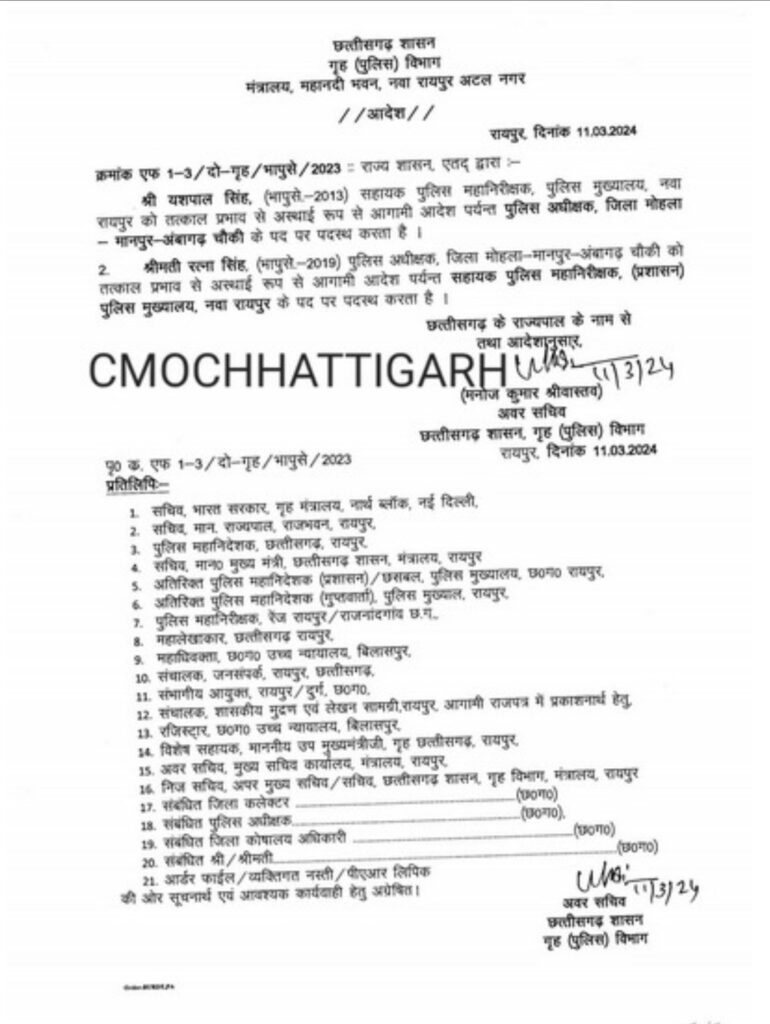 श्रीमती रत्ना सिंह को SP के पद से हटाते हुए उन्हें सहायक पुलिस महानिरीक्षक ( प्रशासन ) पुलिस मुख्यालय नया रायपुर में पदस्थ किया गया है.