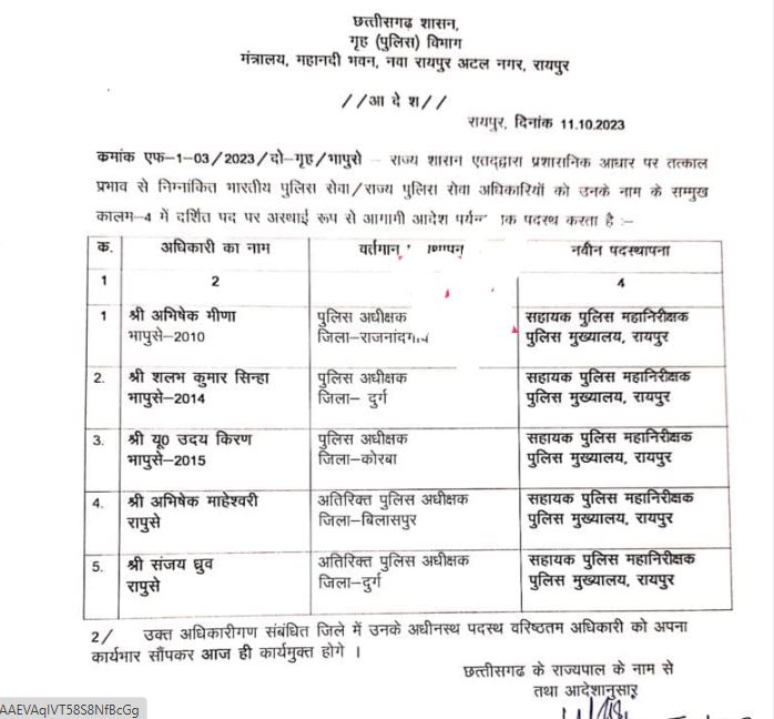 नई पोस्टिंग पाने वाले अधिकारियों में राजनांदगांव के पूर्व एसपी अभिषेक मीणा, दुर्ग के पूर्व एसपी शलभ कुमार सिन्हा, कोरबा के पूर्व एसपी उदय किरण, बिलासपुर के पूर्व एएसपी अभिषेक माहेश्वरी और दुर्ग के पूर्व एएसपी संजय ध्रुव शामिल हैं।